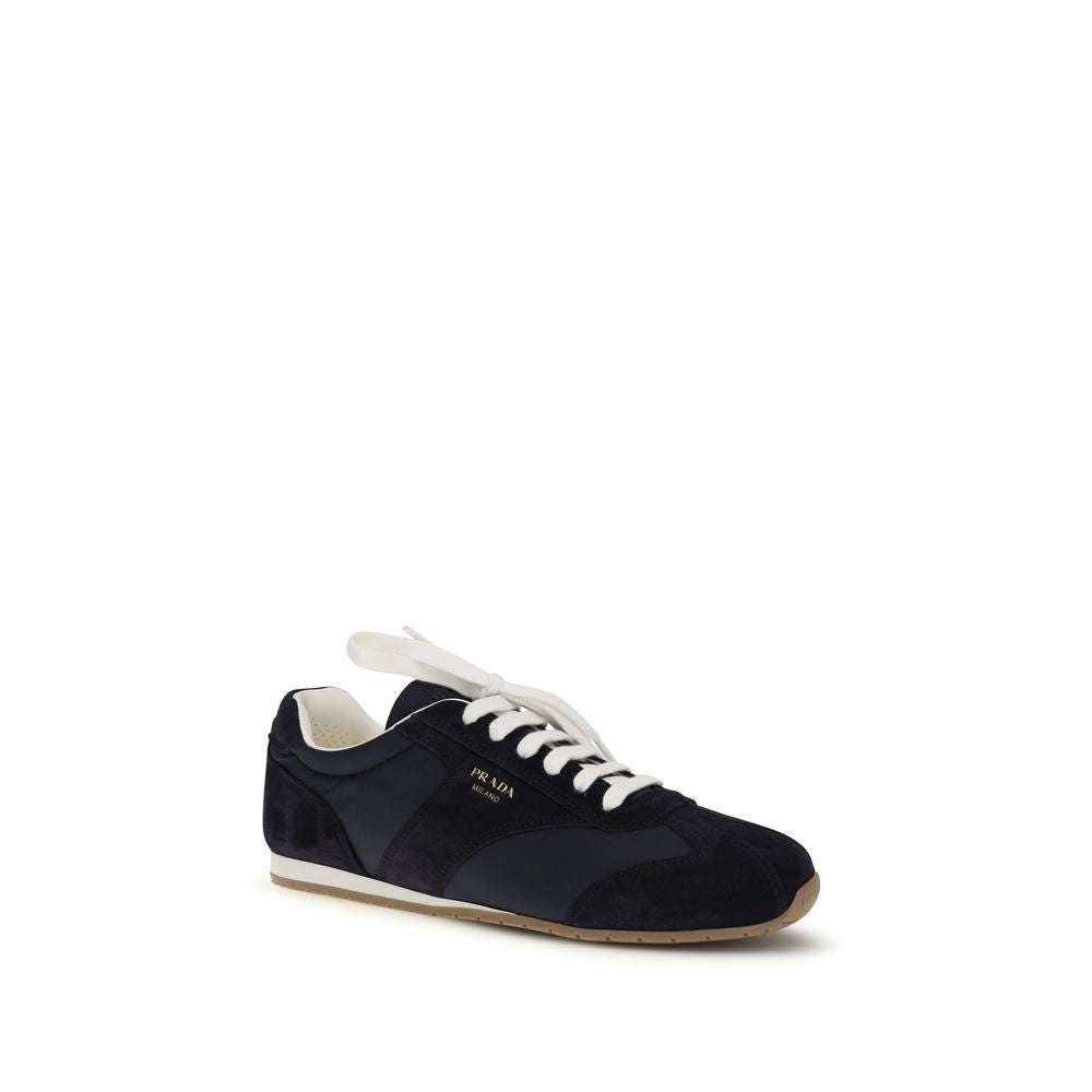 The two-tone suede and fabric Sneakers by Prada combine comfort and style in a modern and refined design. Made from suede and fabric, these sneakers feature a printed logo on the heel and a laminated logo on the side, a distinctive detail that enhances their look. The lace-up closure ensures a secure fit, while the padded ankle provides extra comfort. The embossed logo on the tongue and the printed logo on the inside complete the design, making these sneakers a real must-have for those looking for a mix of elegance and practicality.